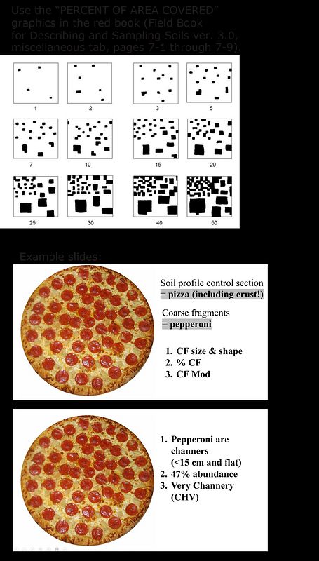4. For each pizza, have the students give: (1) size, shape, and % rock fragments for each topping (2) Total %RF (3) RF modifier, if necessary, using the correct abbreviations